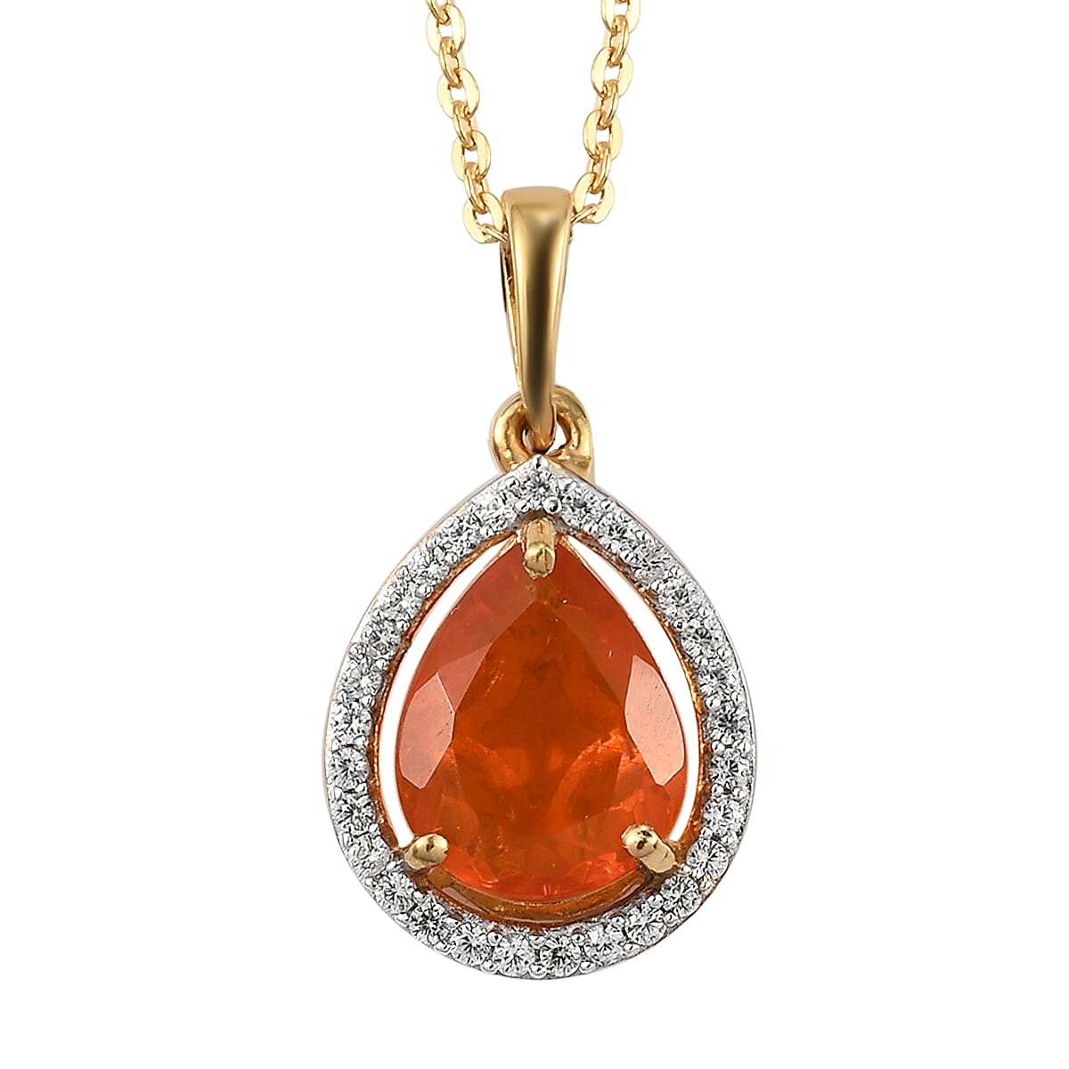 Inspired by a drop theme, pear-shaped Crimson fire opal sways in the zircon studded fancy pear-shaped frame. The drop pendant is a drop gemstone suspended from a metallic frame. This drop pendant necklace is meticulously designed to showcase the purity of Crimson fire opal. It represents an explosion of orange color with a full spectrum that swivels to reveal new hues that create magnetic jewelry. This yellow gold vermeil-plated sterling silver pendant necklace is a great way to add the beauty of vibrant and attractive stones to your jewelry collection.