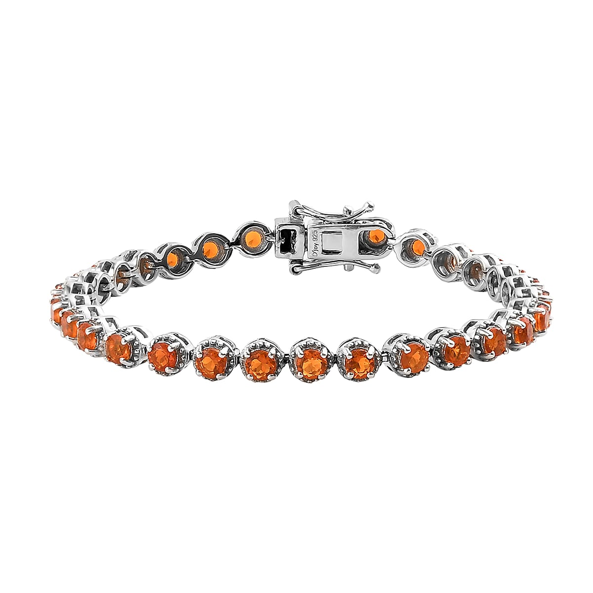 The crimson fire opal tennis bracelet is reminiscent of the crimson forest. Each round crimson fire opal is carefully linked for perfect articulation. This tennis bracelet is designed in sterling silver with a platinum finish, exuding brilliance of creamy red-yellow hues. The tab insert clasp allows you to adorn the bracelet with sheer comfort. The crimson forest symbolizes passionate love. This tennis bracelet will flow freely around your wrist.