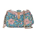 The crystal-studded clutch exudes glamour with its dazzling embellishments, making it a perfect accessory for evening events. Its compact design provides ample space for essentials while adding a touch of sparkle to any outfit.