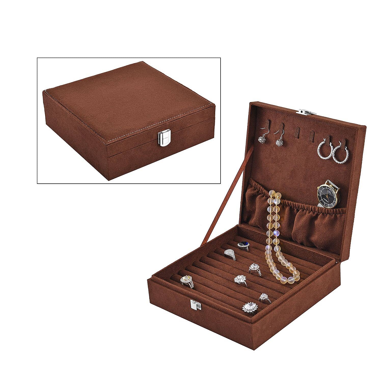 Dark Brown Velvet Anti Tarnish Jewelry Box with Latch Clasp (11 Ring Slot, 6 Hooks for Necklace, Pocket)