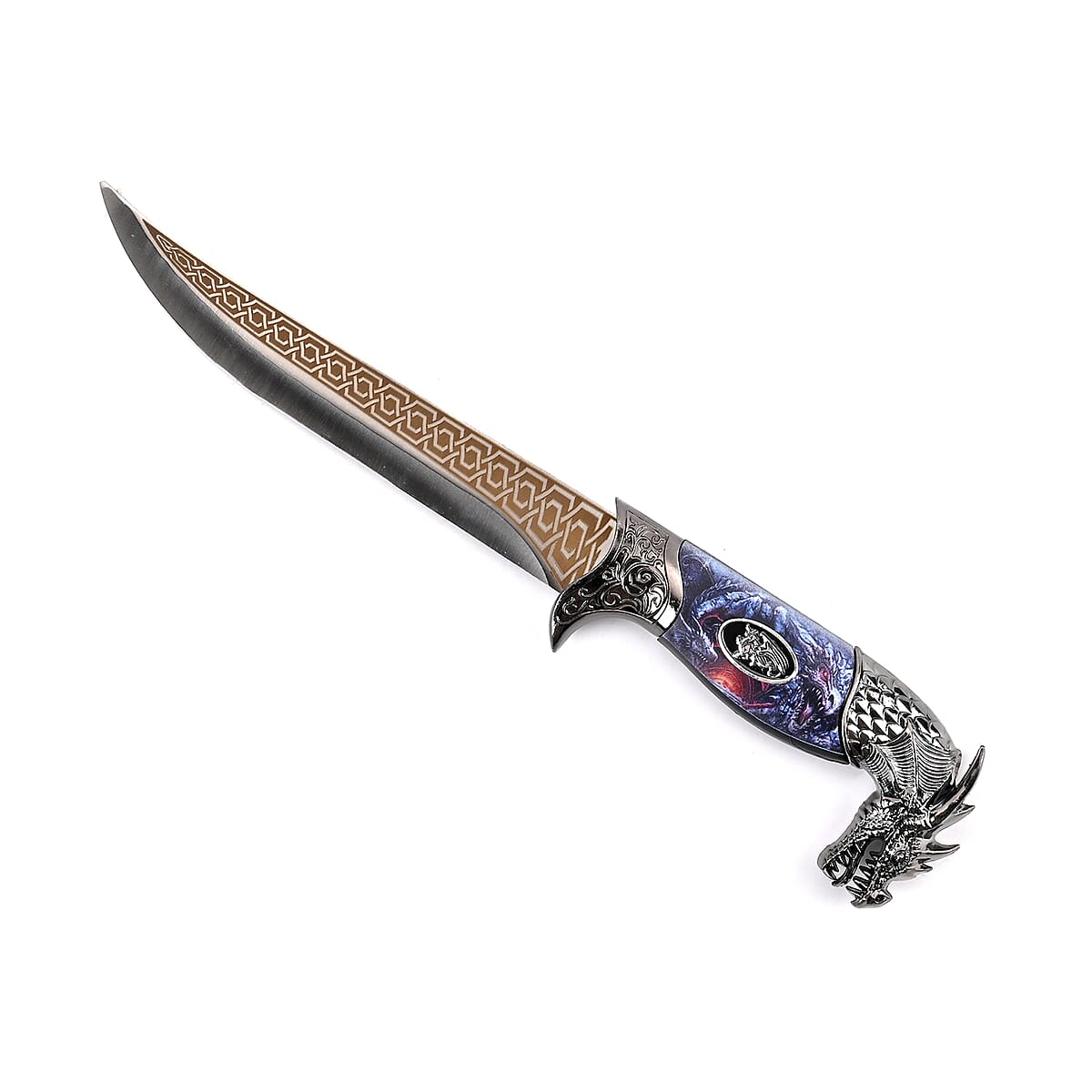 Dark Silver Outdoor Hunting Knife Stainless Steel Blade 6.6 and Scabbard Handle with Dragon Head Pommel