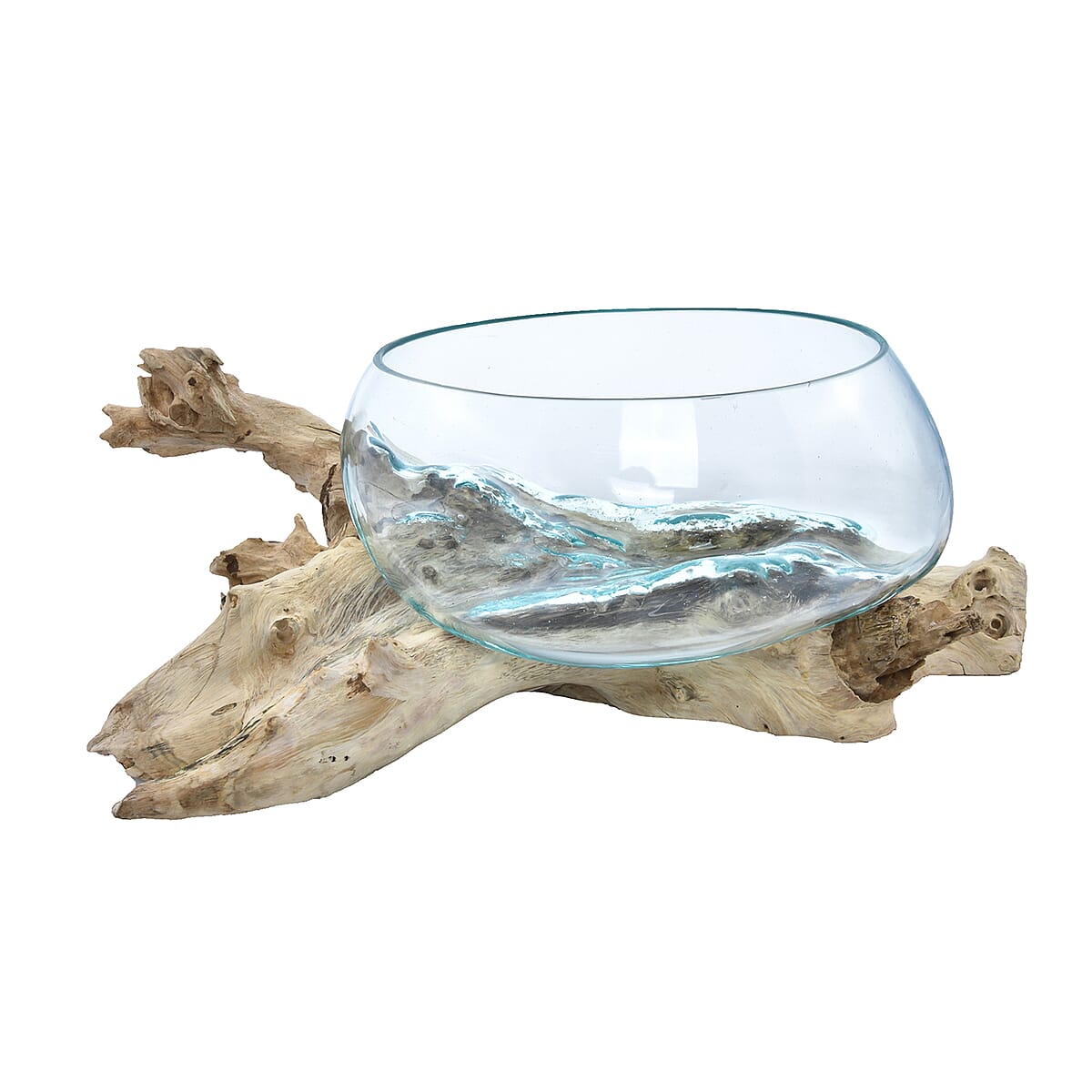 Your search for something as fascinating as unique it can be finally summoned with this art piece featuring clear recycled glass and wood. Crafted of artistic imagery, it is unique, authentic, and organic on all grounds. The glass is hand-blown in the traditional Balinese Way. It is crafted using a natural product by using hand tools. Centuries-old glass blowing technique is used. Hot glass is then relaxed over a piece of wooden root. The glass then hardens to the shape of the wood, ensuring a uniquely perfect fit and TADAAA… there is your art piece!