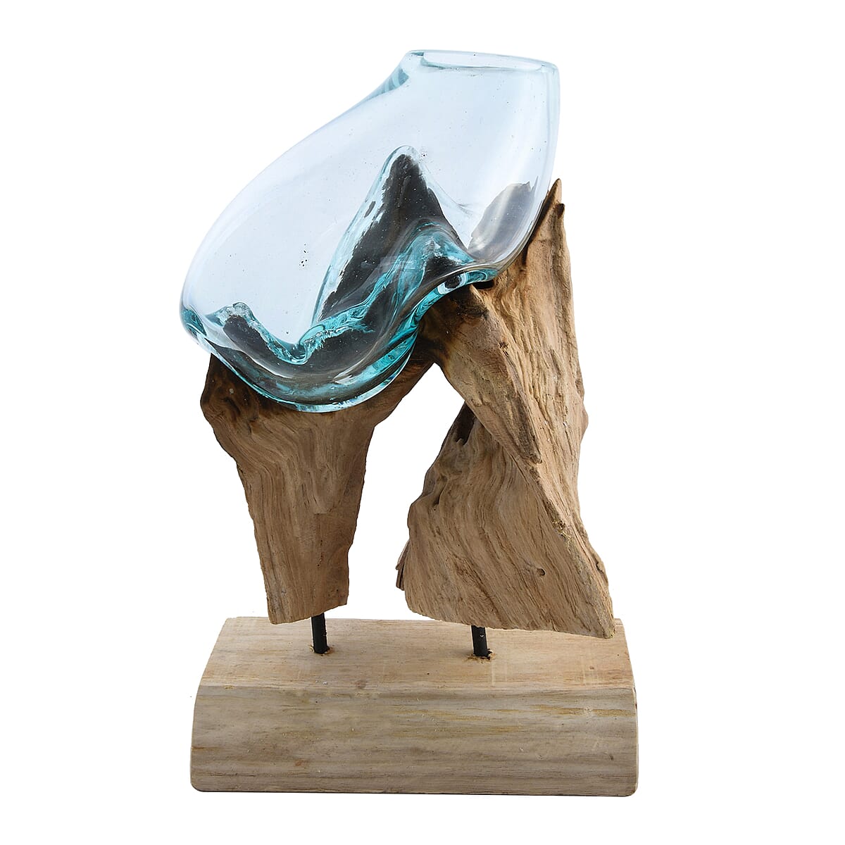 Introducing our handblown sculpture shape molten glass bowl with a wood base - an exquisite masterpiece that effortlessly combines art and functionality. This unique glass décor bowl is meticulously crafted from molten recycled glass, resulting in a stunning, one-of-a-kind sculpture shape that's sure to be a conversation starter. The bowl sits on a beautifully crafted wooden base made from responsibly sourced wood, adding a warm and natural touch to this modern, eco-friendly design. With its generous size and versatile style, this wood décor piece is perfect for adding a touch of sophistication to any living space.