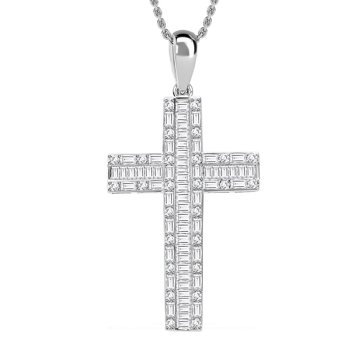 The diamond cross pendant features a stunning blend of channel and prong-set gems, creating a radiant display of brilliance. Crafted in sterling silver, it offers a timeless symbol of faith and elegance. This sterling silver pendant is a versatile addition to any jewelry collection.