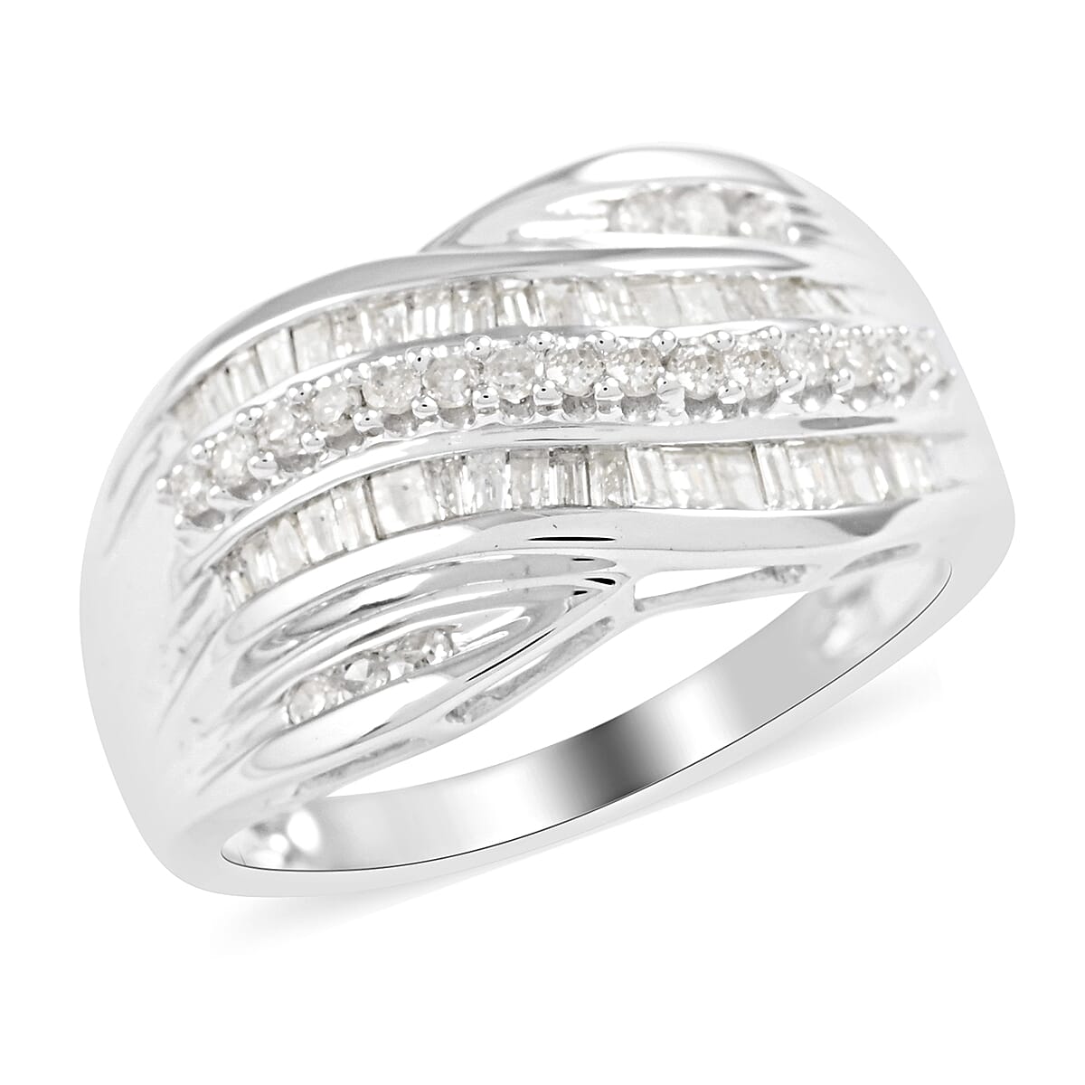 Designed in the criss-cross pattern, this diamond ring is accented with both round and baguette shaped diamonds. Sparkling with the symmetrically arranged diamonds, this criss-cross diamond ring is a masterpiece to be owned. Criss-cross design symbolizes the merging of two lives, no longer running side by side, in fact, they are intertwined. Crafted in sterling silver, this impressive diamond ring is sparkling with multiple rows. The word diamond derives from the Greek word 'adamas' meaning indomitable and invincible, a hardest natural substance. With its unmatched brilliance and rich sentimental value, a diamond can be cut through another diamond.