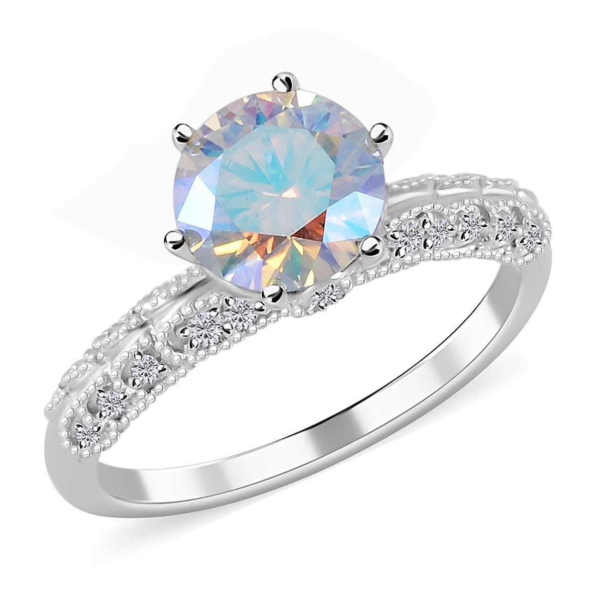 Embark on a mesmerizing journey of light and splendor with the dichroic mist moissanite ring. Set against the cool sheen of rhodium-plated sterling silver, this moissanite fancy ring presents a bewitching play of colors, mirroring the mysteries of the cosmos and the elegance of the ethereal.
