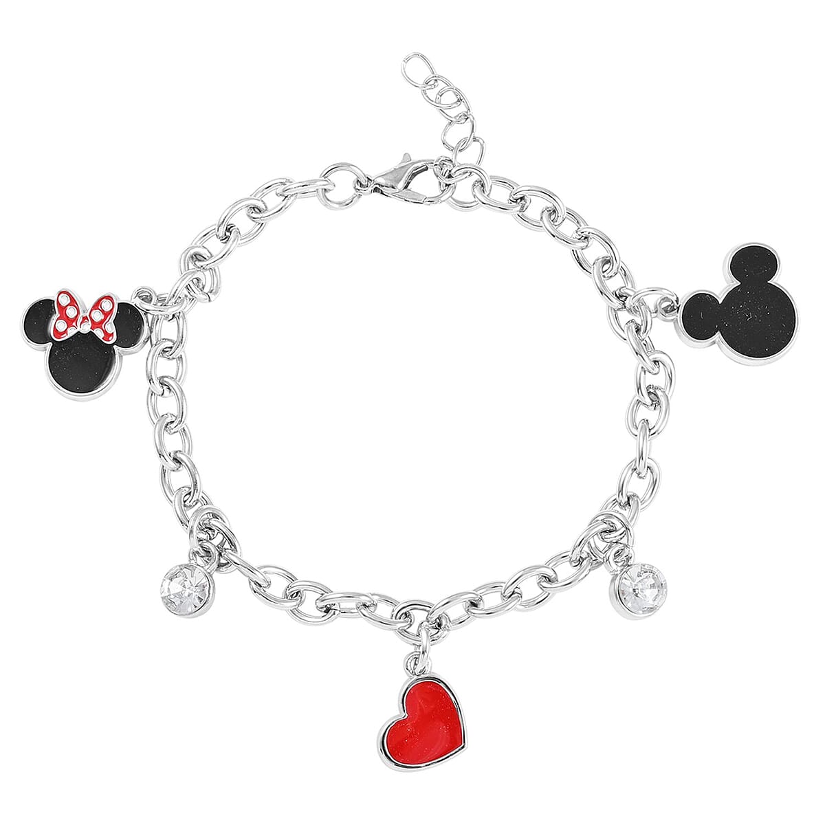 DISNEY Austrian Crystal Minnie and Mickey Mouse Charm Bracelet 6.50-7.50 Inches in Rhodium Over Silvertone