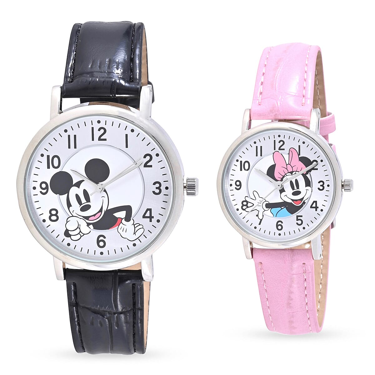 DISNEY Set of 2 Japanese Movement Mickey and Minnie Watch with Black Vegan Croc Leather (44mm, 7-9) & Pink Vegan Croc Leather (34mm, 6-8)
