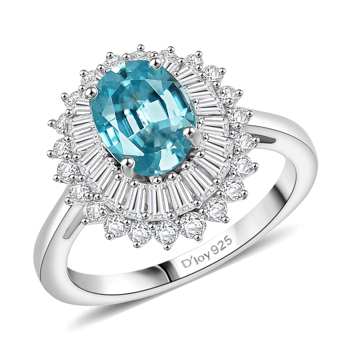 D'Joy AAA Cambodian Blue Zircon and Moissanite 3.30 ctw Azure Sunflare Ring in Rhodium Over Sterling Silver (Size 10.0)