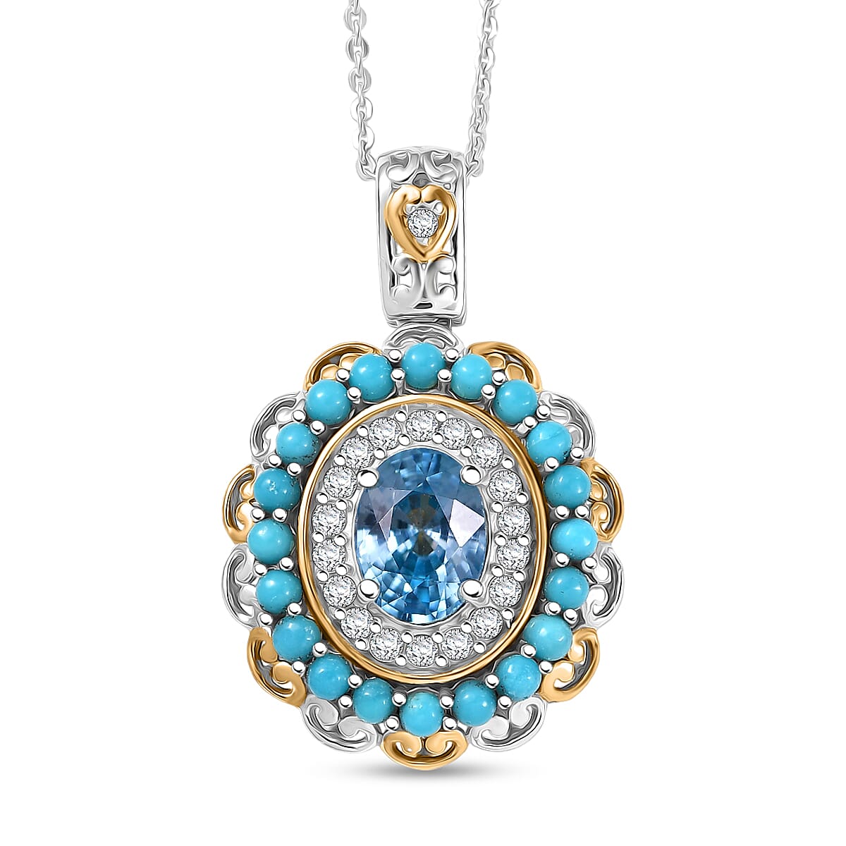 D'Joy AAA Cambodian Blue Zircon and Multi Gemstone 3.10 ctw Oceanfire Royale Pendant Necklace in 18K Vermeil YG and Rhodium Over Sterling Silver 20 Inches