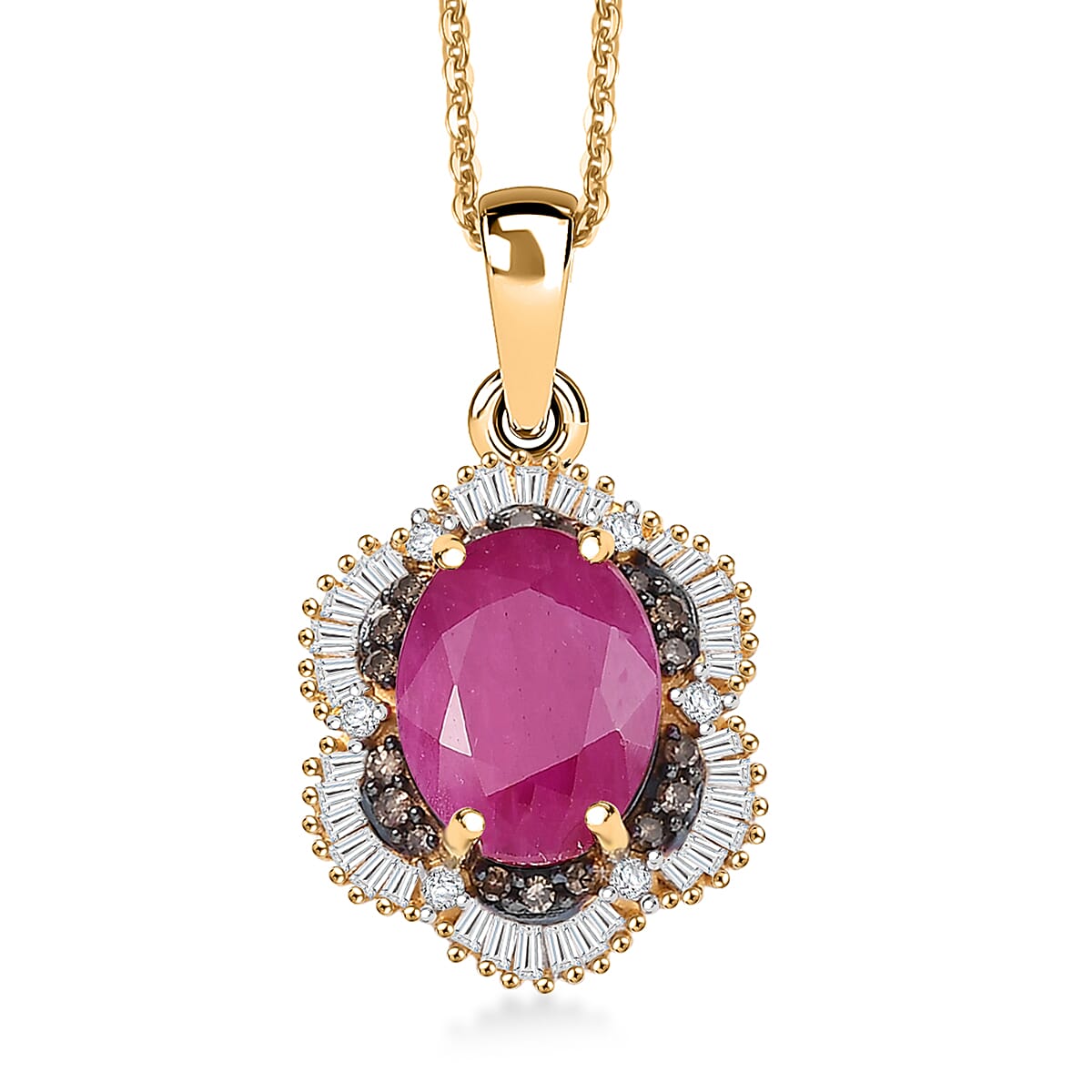 D'Joy AAA Royal Ruby, Natural Champagne and White Diamond 3.10 ctw Signature Spotlight Pendant Necklace in 18K Vermeil Yellow Gold Over Sterling Silver 20 Inches
