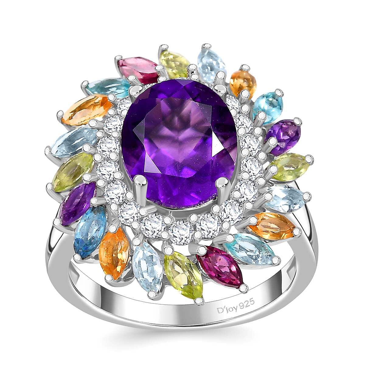 D'Joy African Amethyst and Multi Gemstone 4.50 ctw Floral Ring in Rhodium Over Sterling Silver (Size 9.0)