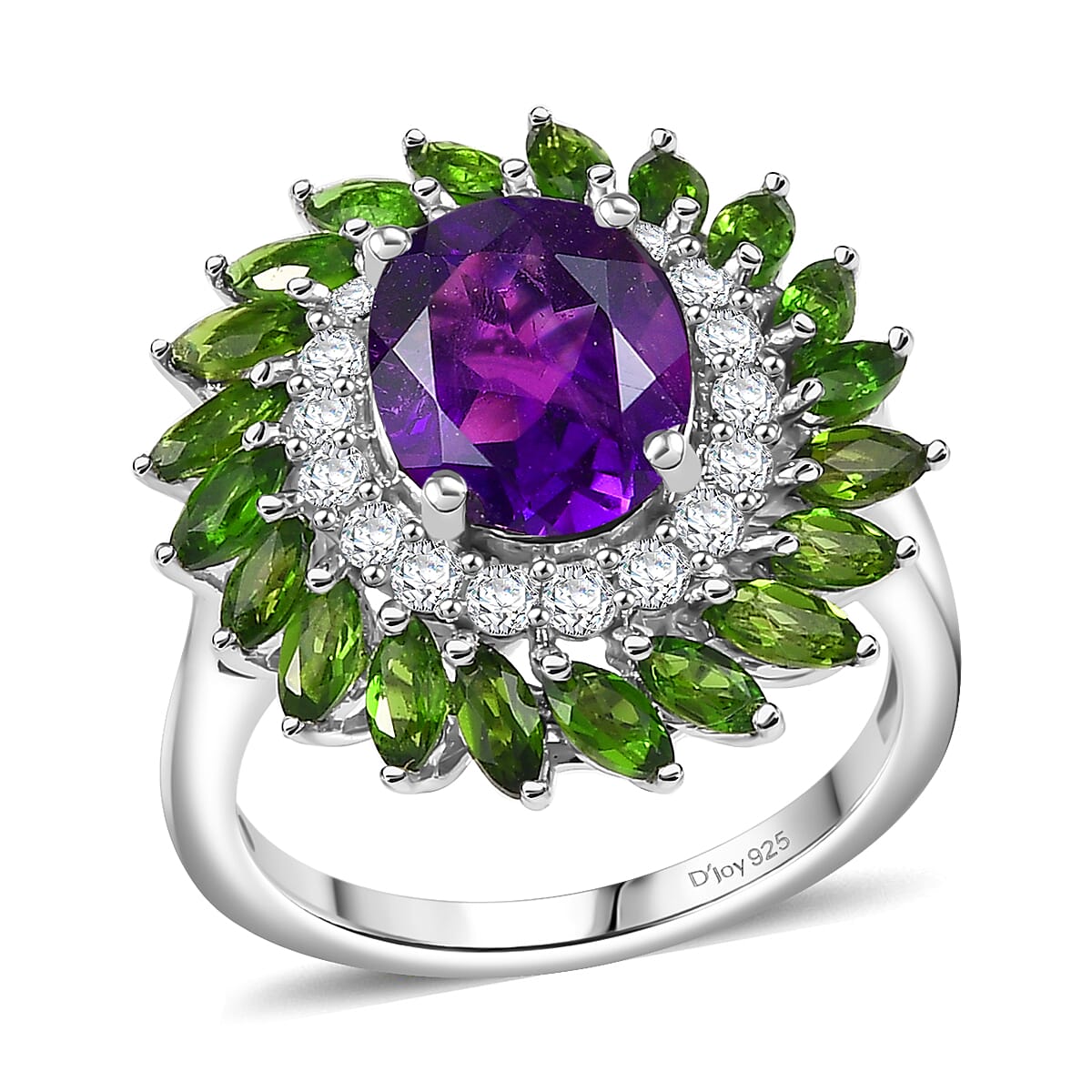 Celebrate vibrant elegance with this D'joy African amethyst ring in sterling silver. This stunning multi-gemstone ring features a vivid amethyst surrounded by colorful gems. The intricate floral ring design adds timeless charm to your jewelry box. You will love how effortlessly it brightens your favorite looks.