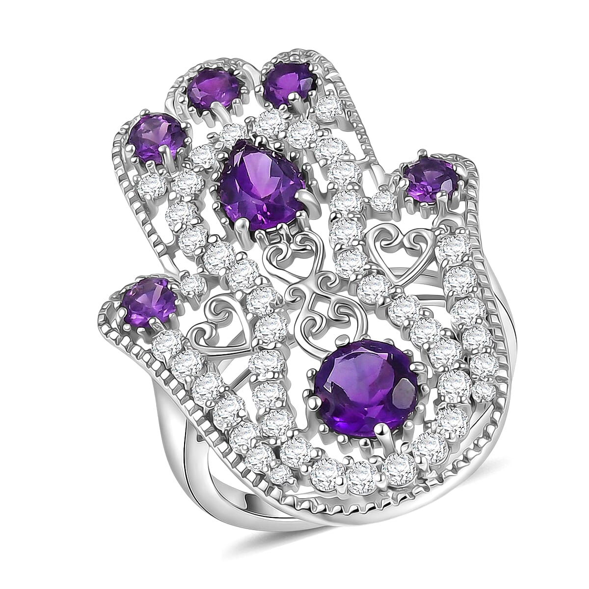 D'Joy African Amethyst and White Zircon 4.15 ctw Hamsa Ring in Rhodium Over Sterling Silver (Size 9.0)