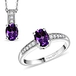 D'Joy African Amethyst, White Zircon Ring (Size 8.0), Pendant Necklace (20 Inches) in Rhodium Over Sterling Silver 1.90 ctw