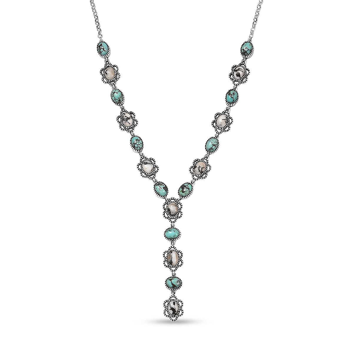 Elevate your look with this D’Joy turquoise and white buffalo necklace in 925 sterling silver. This elegant fashion necklace features blue moon turquoise and white buffalo stones for a bold, artisan-crafted statement. Perfect for layering or standalone wear, it adds distinctive character to both casual and elevated looks.