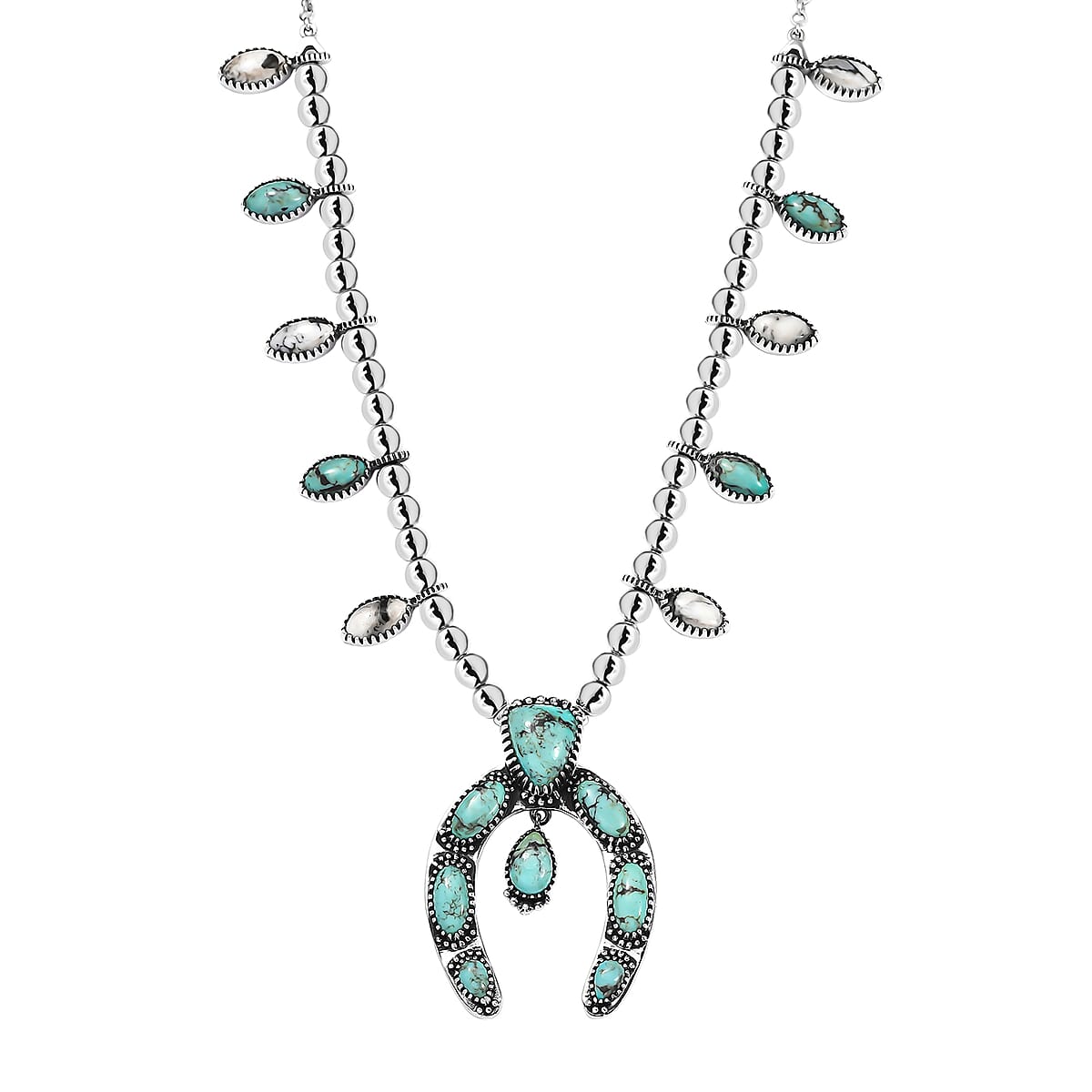 D'Joy Artisan Crafted Premium Blue Moon Turquoise and White Buffalo 21.40 ctw Squash Blossom Necklace in Sterling Silver 18-20 Inches (Del. in 8-10 Days)