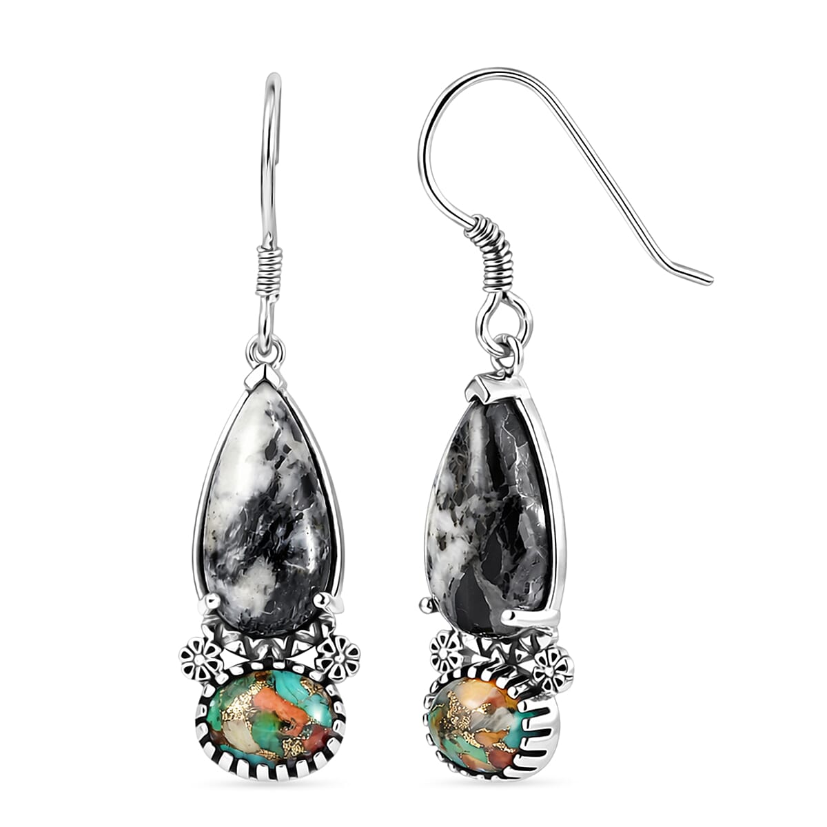 D'Joy Artisan Crafted White Buffalo and Spiny Oyster 10.30 ctw Dangling Earrings in Sterling Silver