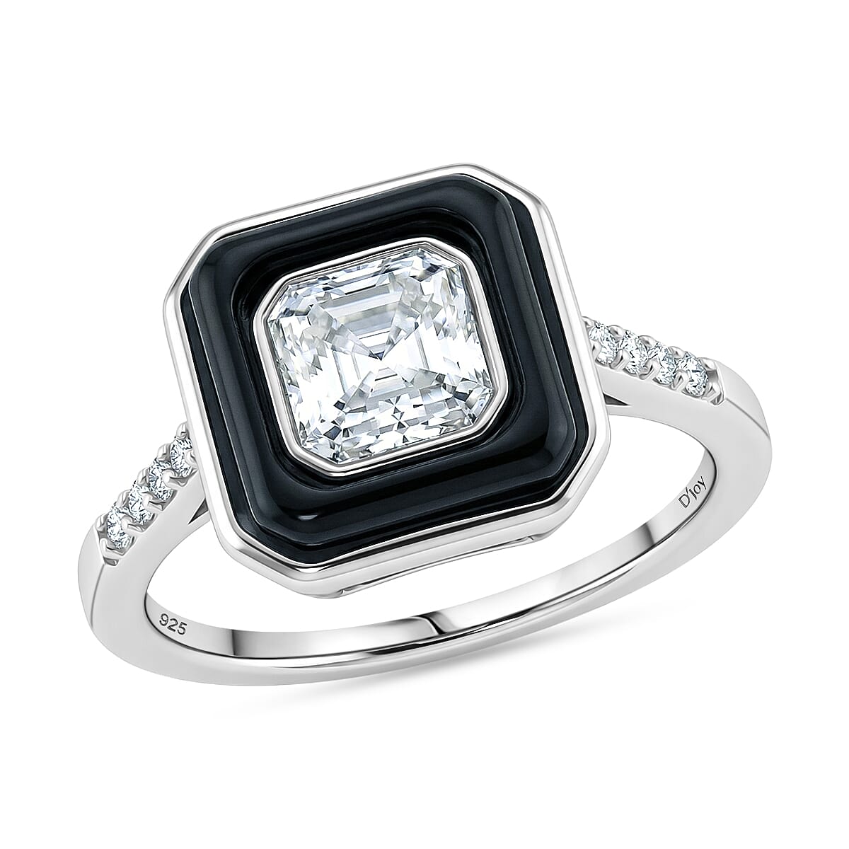 D'Joy Asscher Cut Moissanite and Black Jade (D) 3.65 ctw Midnight Spark Ring in Rhodium Over Sterling Silver (Size 5.0)