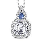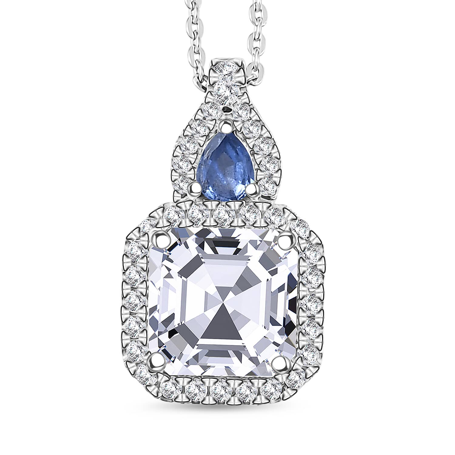 D'Joy Asscher Cut Moissanite, Ceylon Blue Sapphire Pendant Necklace in Rhodium Over Sterling Silver 3.50 ctw (20 Inches)