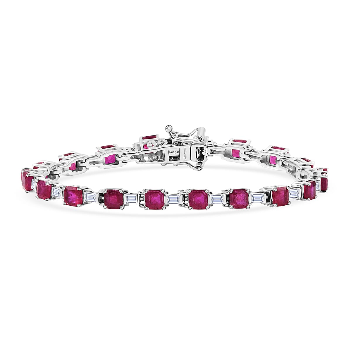 D'Joy Asscher Cut Niassa Ruby (FF) and Moissanite 12.65 ctw Linear Architecture Bracelet in Rhodium Over Sterling Silver (7.25 In)
