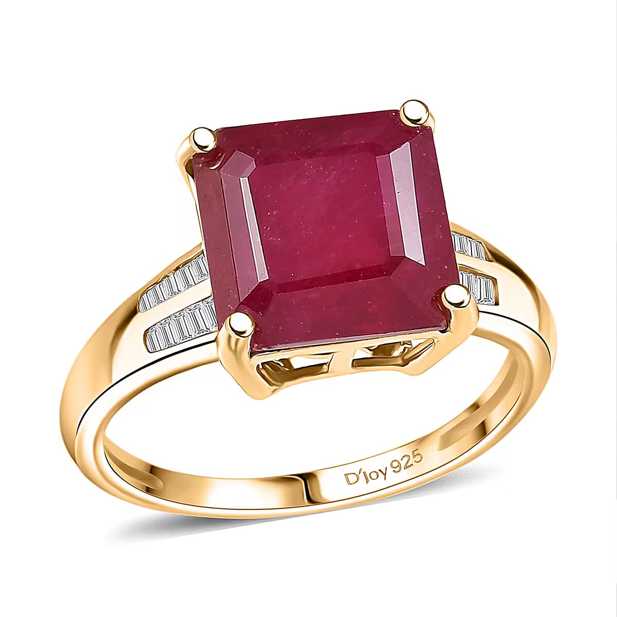 D'Joy Asscher Cut Premium Niassa Ruby (FF) and Diamond 7.60 ctw Art Deco Ring in 18K Vermeil Yellow Gold Over Sterling Silver (Size 8.0)