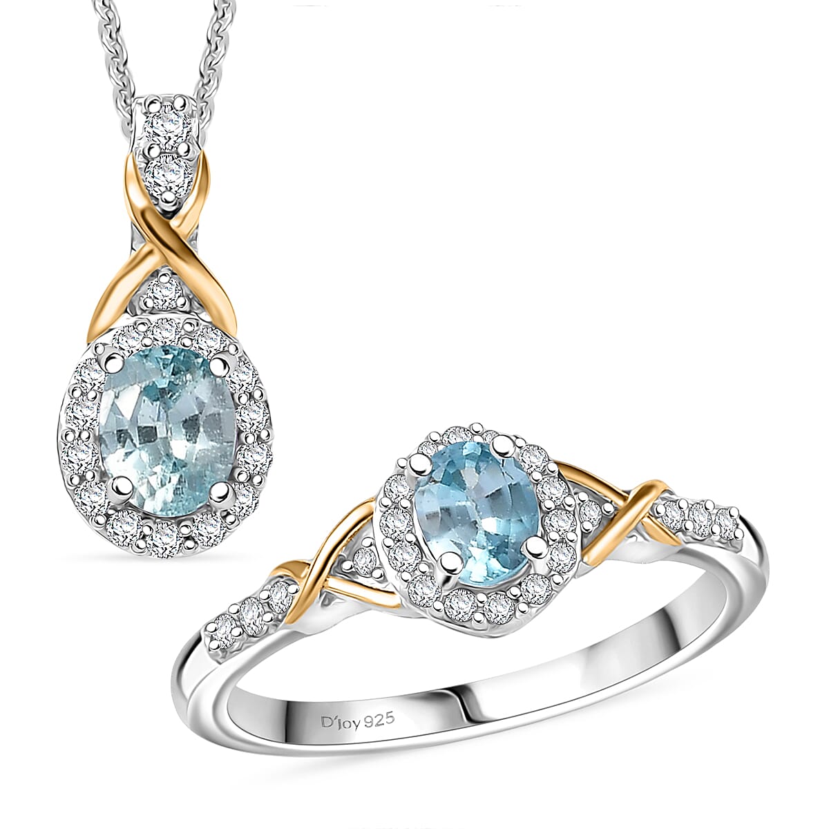D'Joy Blue Zircon and White Zircon 1.59 ctw Ring (Size 7) and Pendant Necklace 20 Inches in 18K Vermeil Yellow Gold and Rhodium Over Sterling Silver
