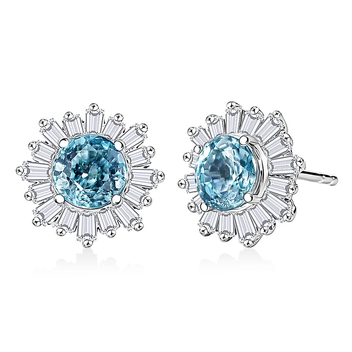 D'Joy Cambodian Blue Zircon and Moissanite 3.85 ctw Ocean Sunburst Earrings in Rhodium Over Sterling Silver