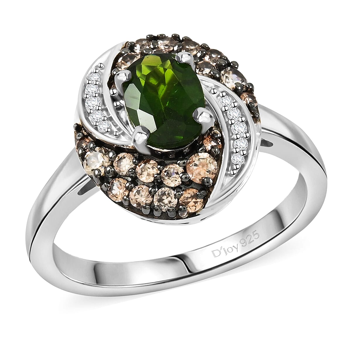 D'Joy Chrome Diopside, Brown and White Zircon 1.50 ctw Sea Wave Ring in Rhodium Over Sterling Silver (Size 9.0)