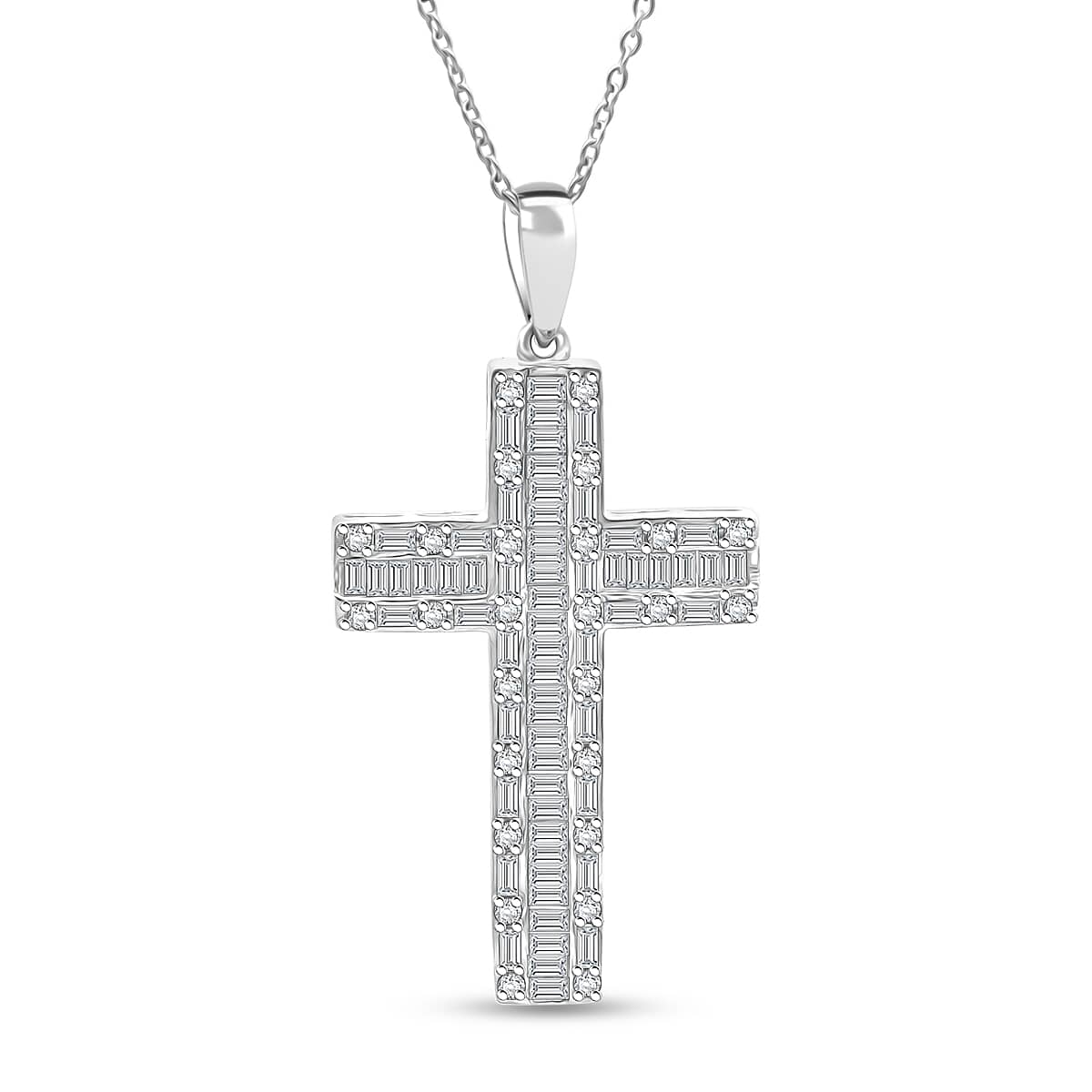 Boasting timeless design, this diamond pendant necklace exemplifies timeless grace and sophistication. This cross necklace showcases sparkling gemstones meticulously set in channel and prong settings. Crafted in sterling silver, the necklace offers both durability and a radiant shine, making it a cherished addition to any jewelry collection. Measuring 20 inches, this silver necklace for women is perfect for layering or wearing solo.