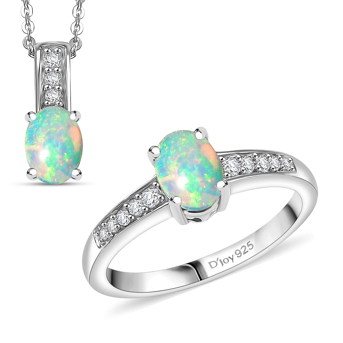 D'Joy Ethiopian Welo Opal and White Zircon 1.40 ctw Ring (Size 9.0), and Pendant Necklace 20 Inches in Rhodium Over Sterling Silver