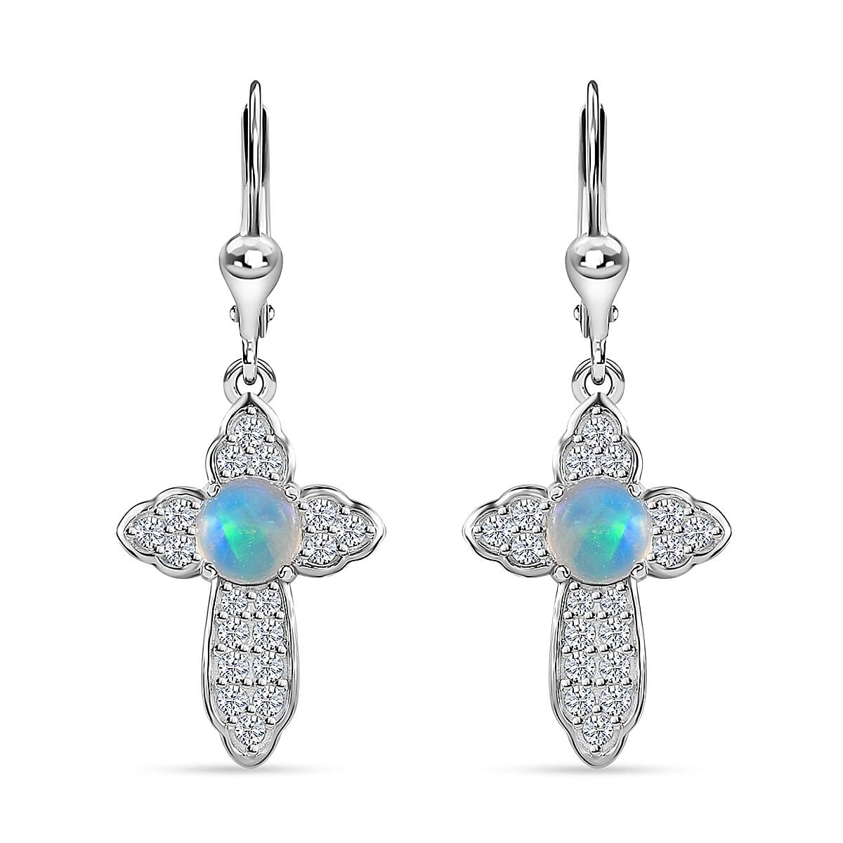 D'Joy Ethiopian Welo Opal and White Zircon Cross Earrings in Platinum Over Sterling Silver 2.25 ctw