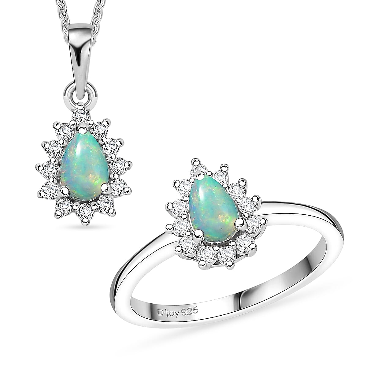 D'Joy Ethiopian Welo Opal, White Zircon 1.10 ctw Ring (Size 5.0) and Pendant Necklace 20 Inches in Rhodium Over Sterling Silver