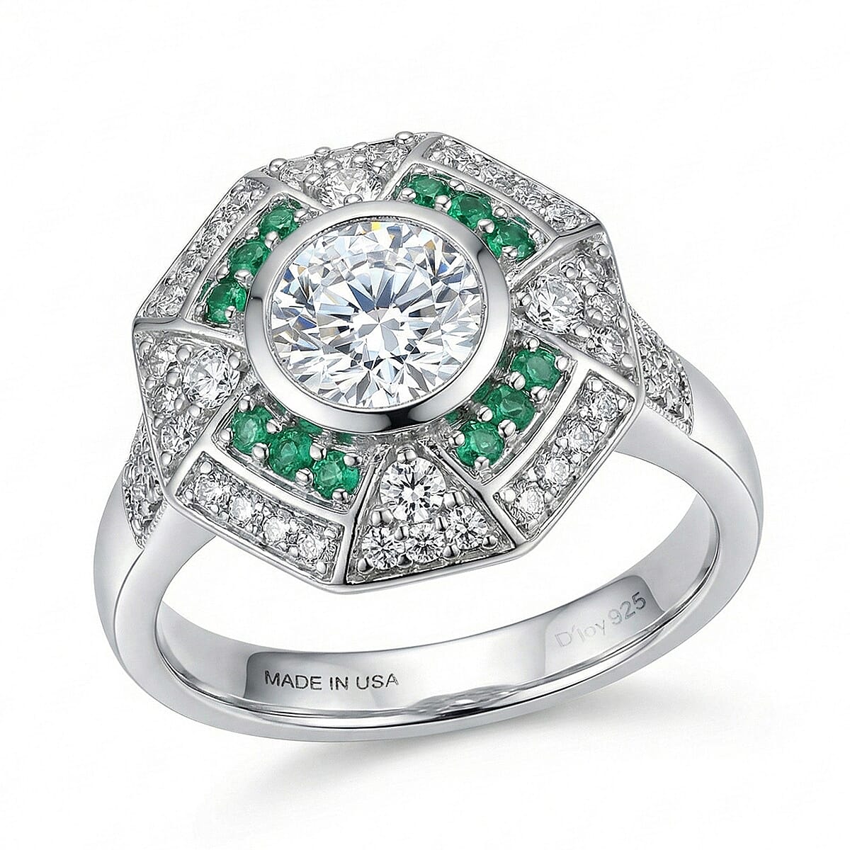 D'Joy Hearts & Arrow Cut Strontium Titanate and Multi Gemstone 3.10 ctw Cathedral Shield Ring in Rhodium Over Sterling Silver (Size 6.0)