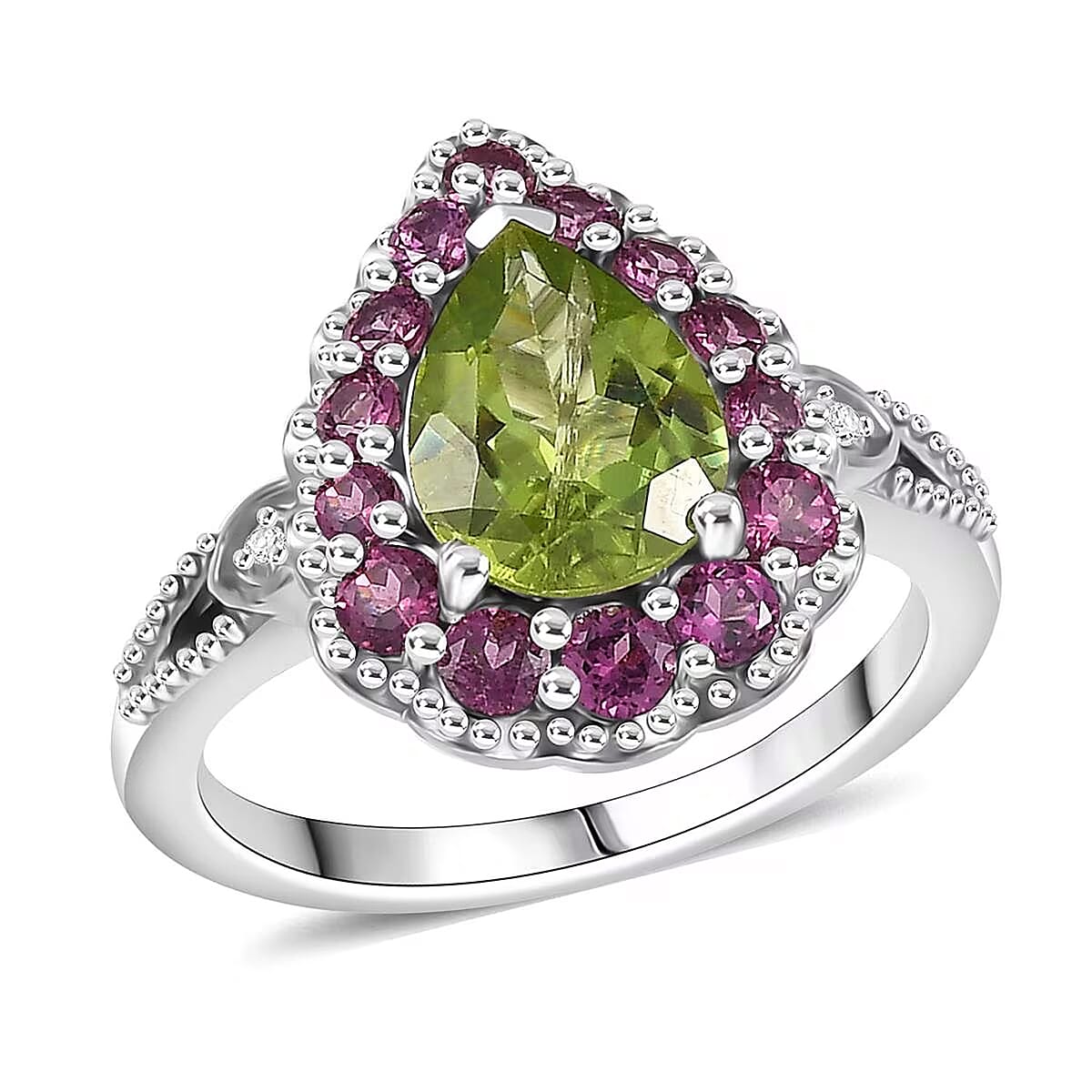 D'Joy Hebei Peridot and Multi Gemstone 2.60 ctw Blushing Dewdrop Ring in Rhodium Over Sterling Silver (Size 5.0)