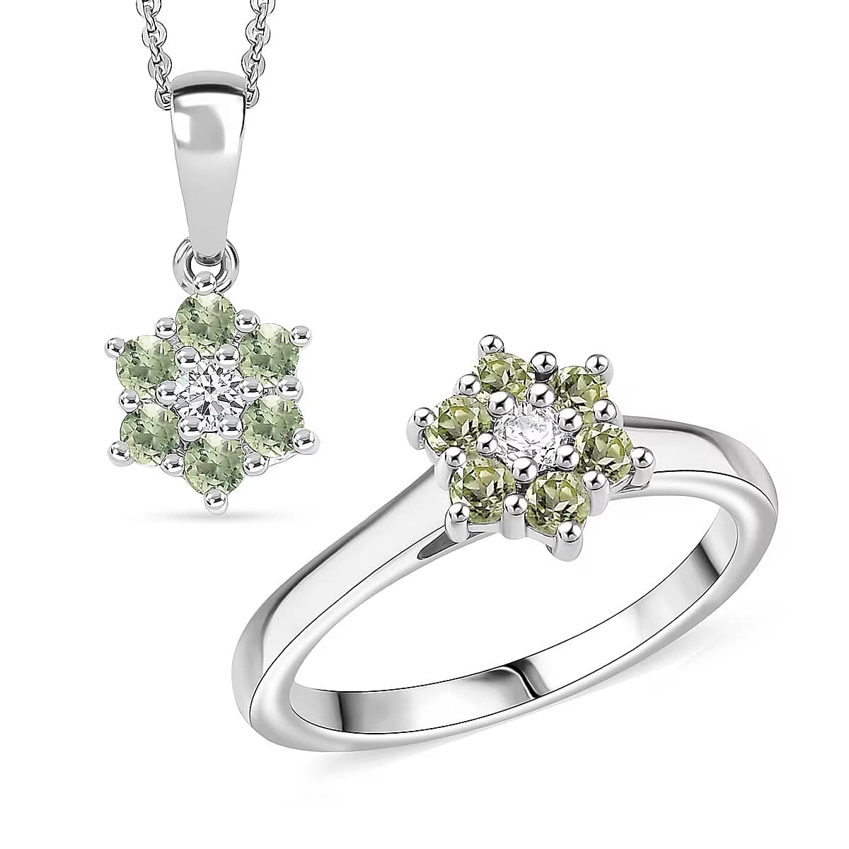D'Joy Hebei Peridot and White Zircon 0.85 ctw Ring (Size 8.0) and Pendant Necklace 20 Inches in Rhodium Over Sterling Silver