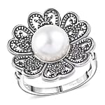 D'Joy Indian Artisan Crafted Freshwater Pearl Flower Petals Ring in Black Oxidised Sterling Silver (Size 5.0)