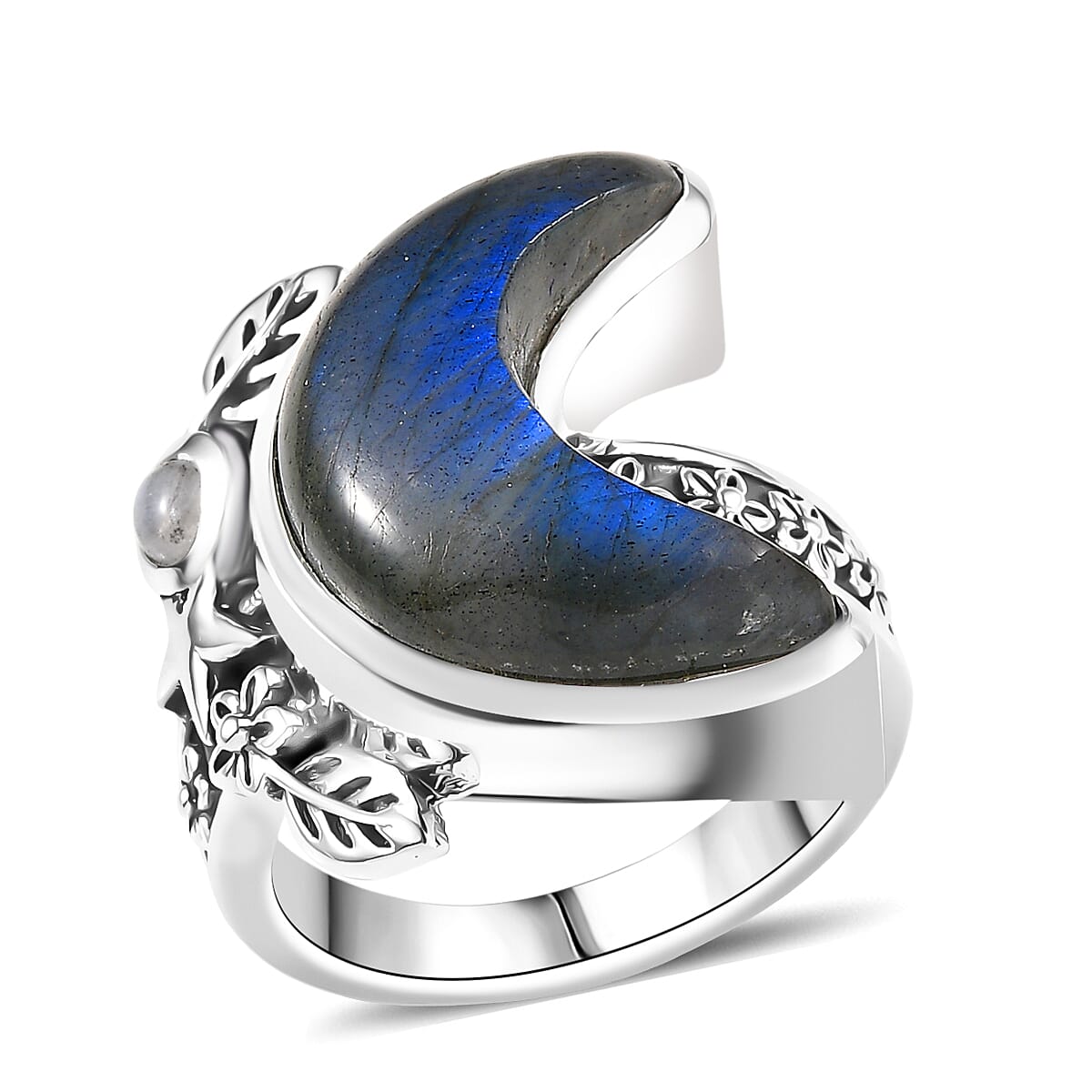 D'Joy Indian Artisan Crafted Malagasy Labradorite, Rainbow Moonstone Moon Star Ring in Sterling Silver 9.40 ctw (Size 9.0)