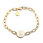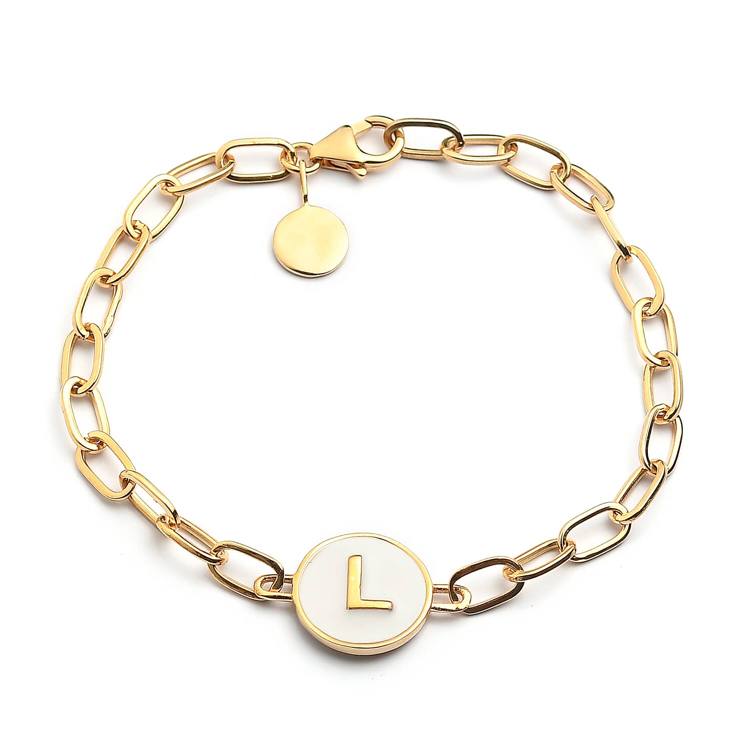 D'Joy Intial L Paper Clip Bracelet , Vermeil Yellow Gold Over Sterling Silver Bracelet , Intial Bracelet , White Enamel Coin Bracelet (7.25 In) 6.85 Grams