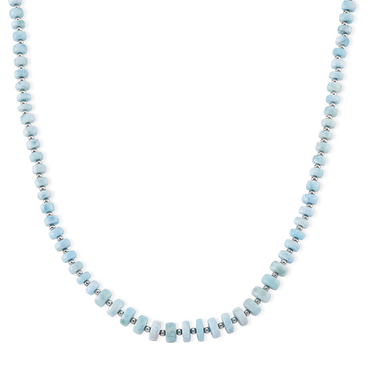 Elevate your style with this D’Joy larimar beaded necklace in 925 sterling silver. This elegant beaded necklace for women features larimar beads with soft blue hues and natural marbled patterns. Strung with precision, it offers a balanced drape that complements both casual and refined outfits.