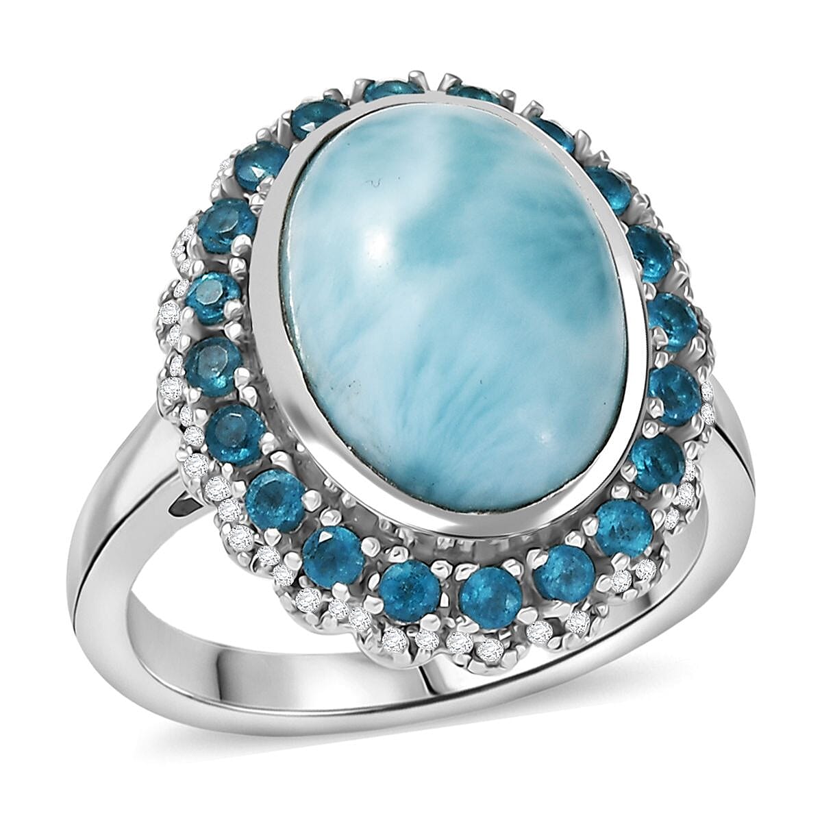 D'Joy Larimar and Multi Gemstone 7.80 ctw Ocean's Halo Ring in Rhodium Over Sterling Silver (Size 9.0)