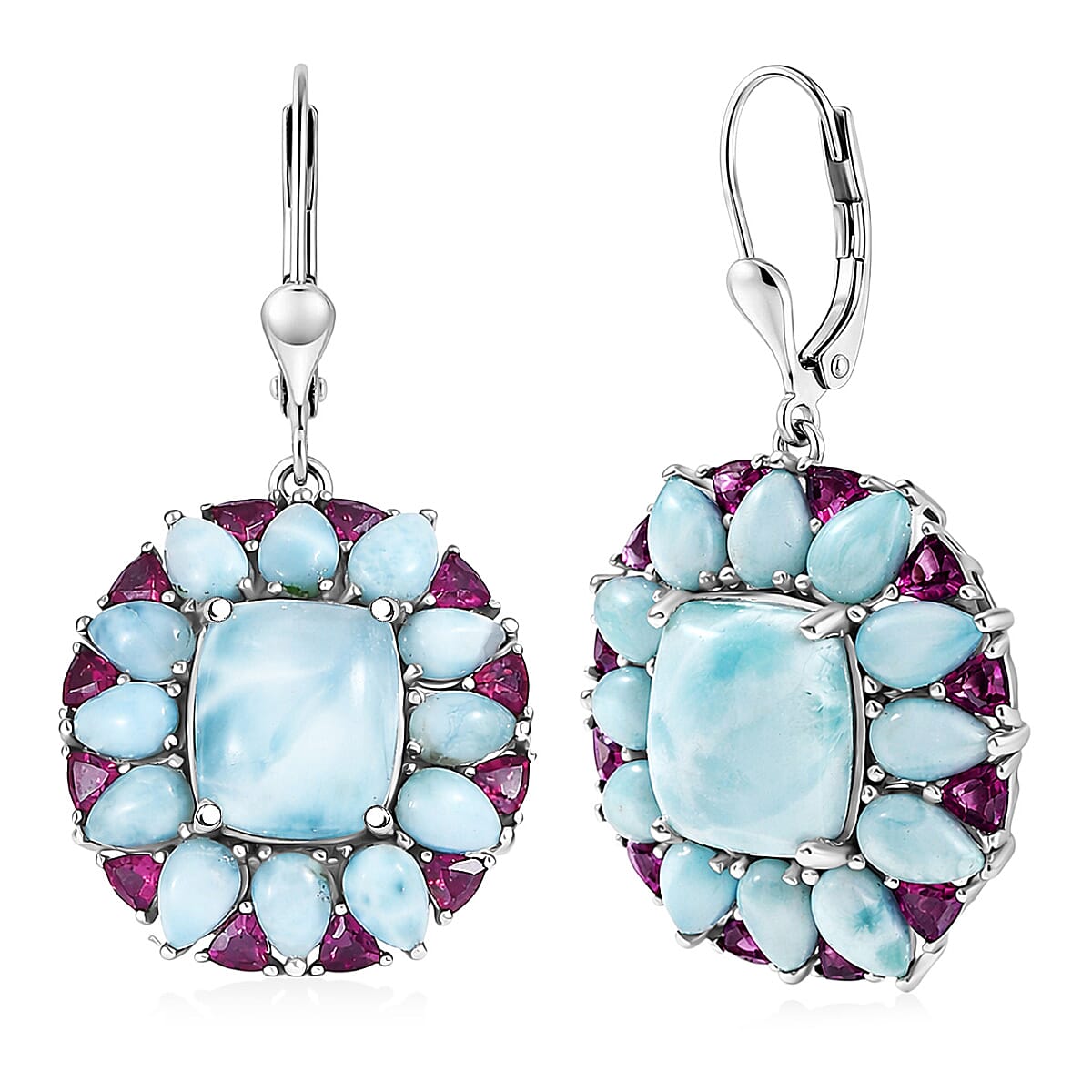 D'Joy Larimar and Orissa Rhodolite Garnet 28.65 ctw Ocean Ripple Halo Earrings in Rhodium Over Sterling Silver