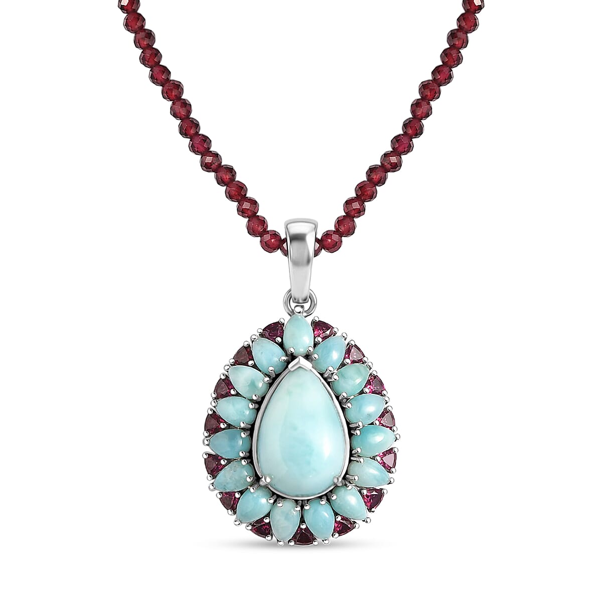 Elevate your look with this D’Joy larimar and garnet pendant with a beaded necklace in 925 sterling silver. This elegant fashion necklace features a larimar centerpiece accented with Orissa rhodolite garnet in a bold design. Finished with a 20-inch beaded strand in rhodium over sterling silver, it offers a refined look.