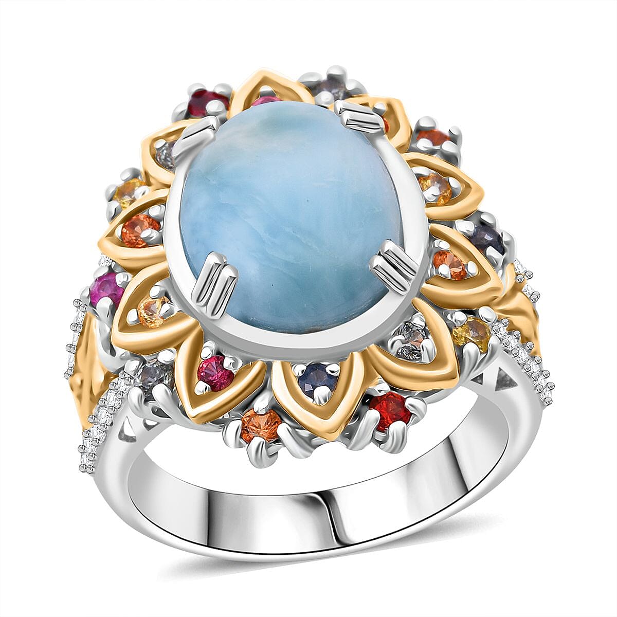 D'Joy Larimar, Multi Gemstone Moonflower Ring in 18K Vermeil YG and Rhodium Over Sterling Silver 5.75 ctw (Size 8.0)