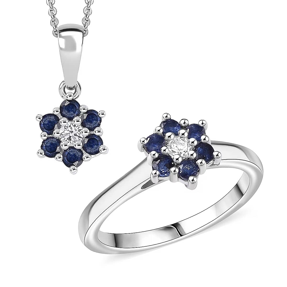 D'Joy Masoala Sapphire (D) and White Zircon 1.00 ctw Ring (Size 6.0) and Pendant Necklace 20 Inches in Rhodium Over Sterling Silver (Del. In 10-12 Days)