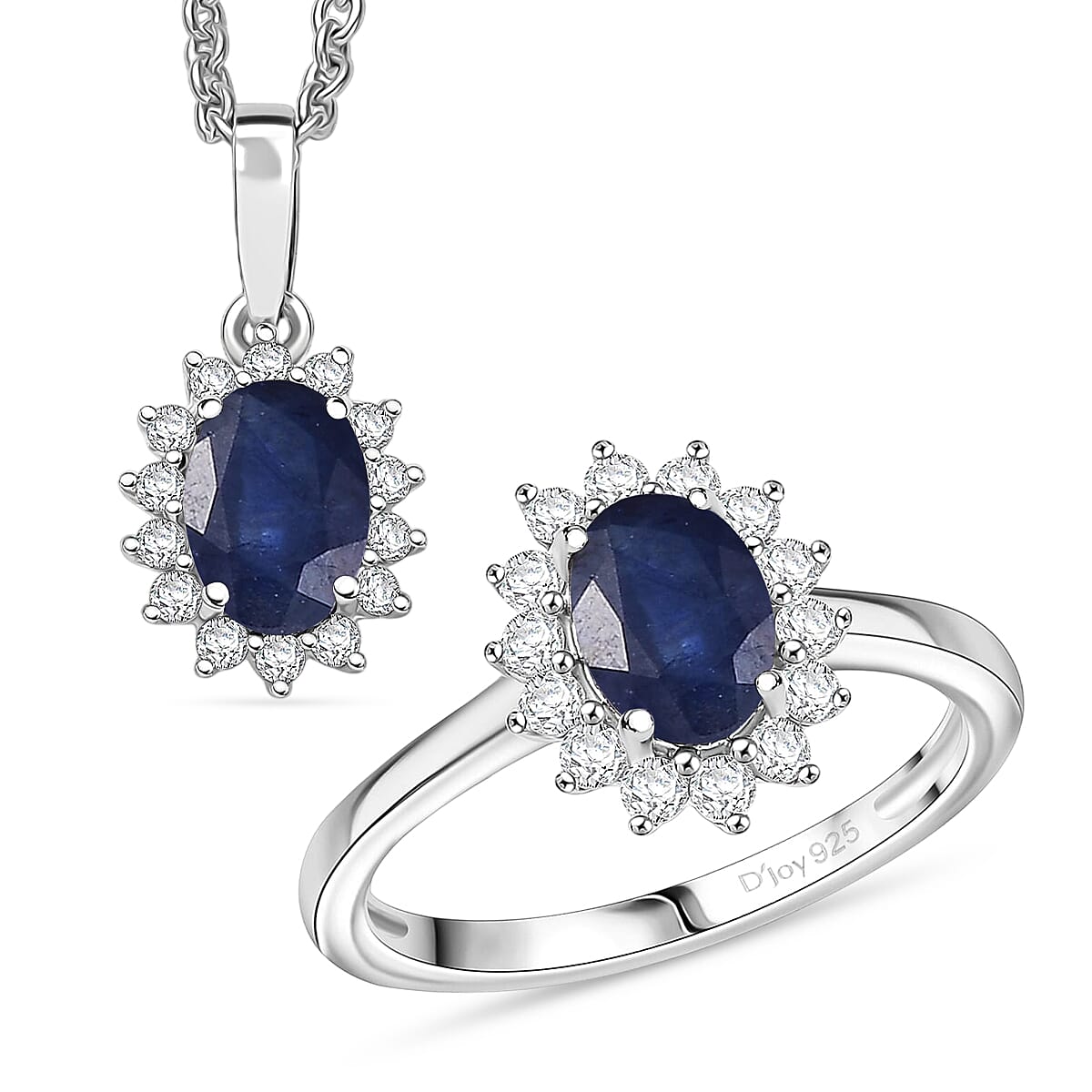 D'Joy Masoala Sapphire (D) and White Zircon 3.40 ctw Ring (Size 9.0) and Pendant Necklace 20 Inches in Rhodium Over Sterling Silver