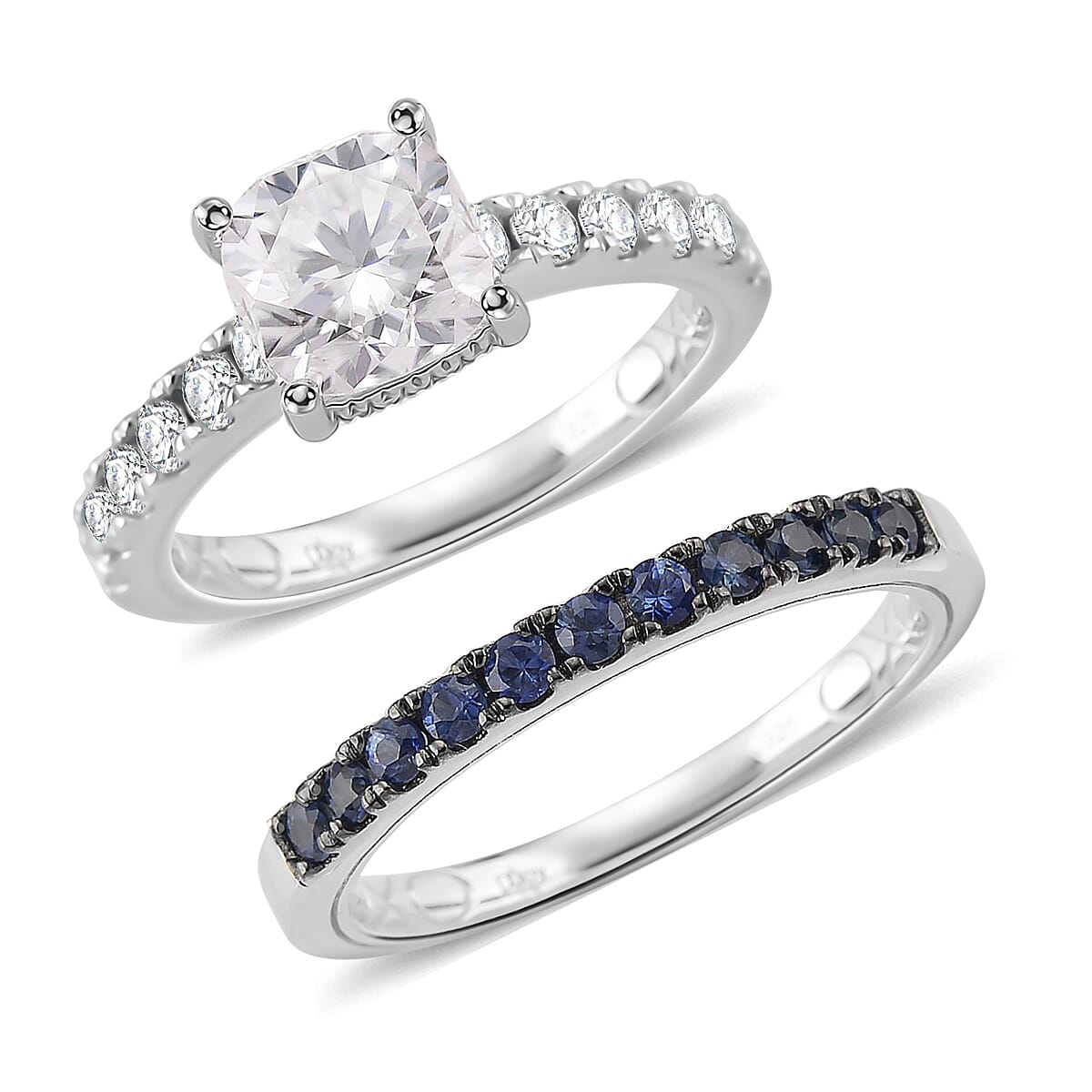 D'Joy Moissanite and Blue Sapphire 3.80 ctw Set of 2 Bridal Ring in Rhodium Over Sterling Silver (Size 10.0)