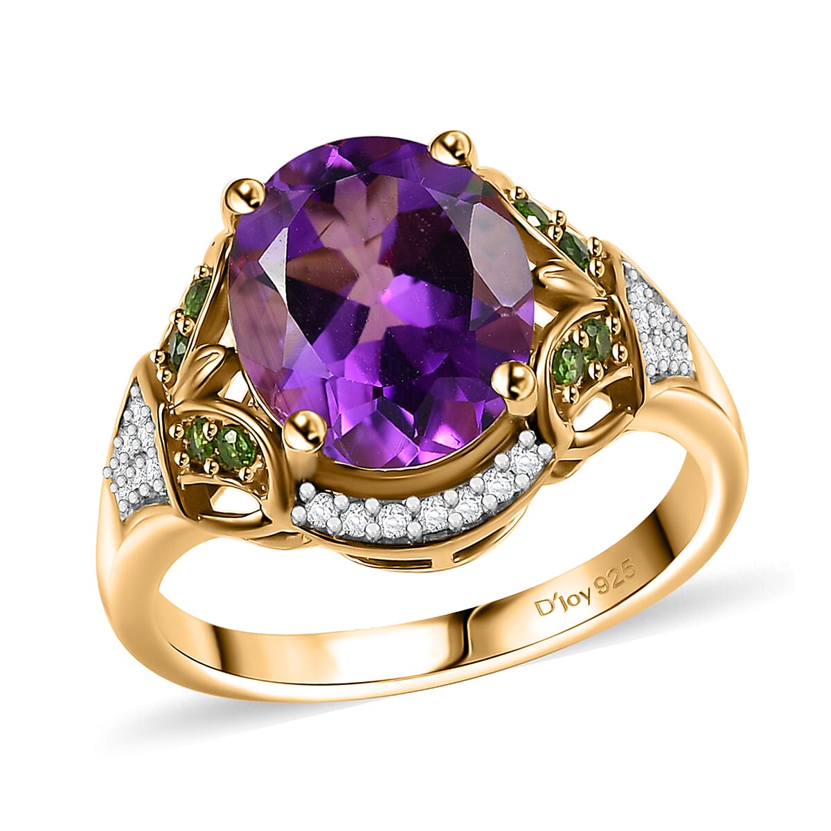 Make a bold statement with D'Joy Moroccan amethyst and multi-gemstone Art Deco ring. The vibrant amethyst, green chrome diopside, and colorless zircons create a stunning visual effect. Let this luxury gemstone ring add refined elegance and beauty to any outfit.