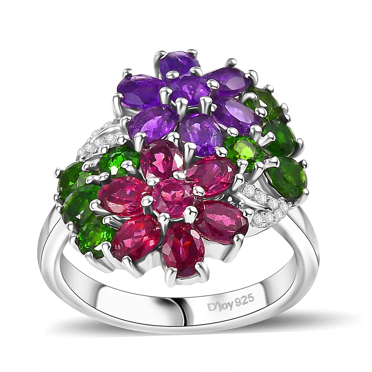 D'Joy Multi Gemstone 4.15 ctw Bunch of Flower Ring in Rhodium Over Sterling Silver (Size 8.0)