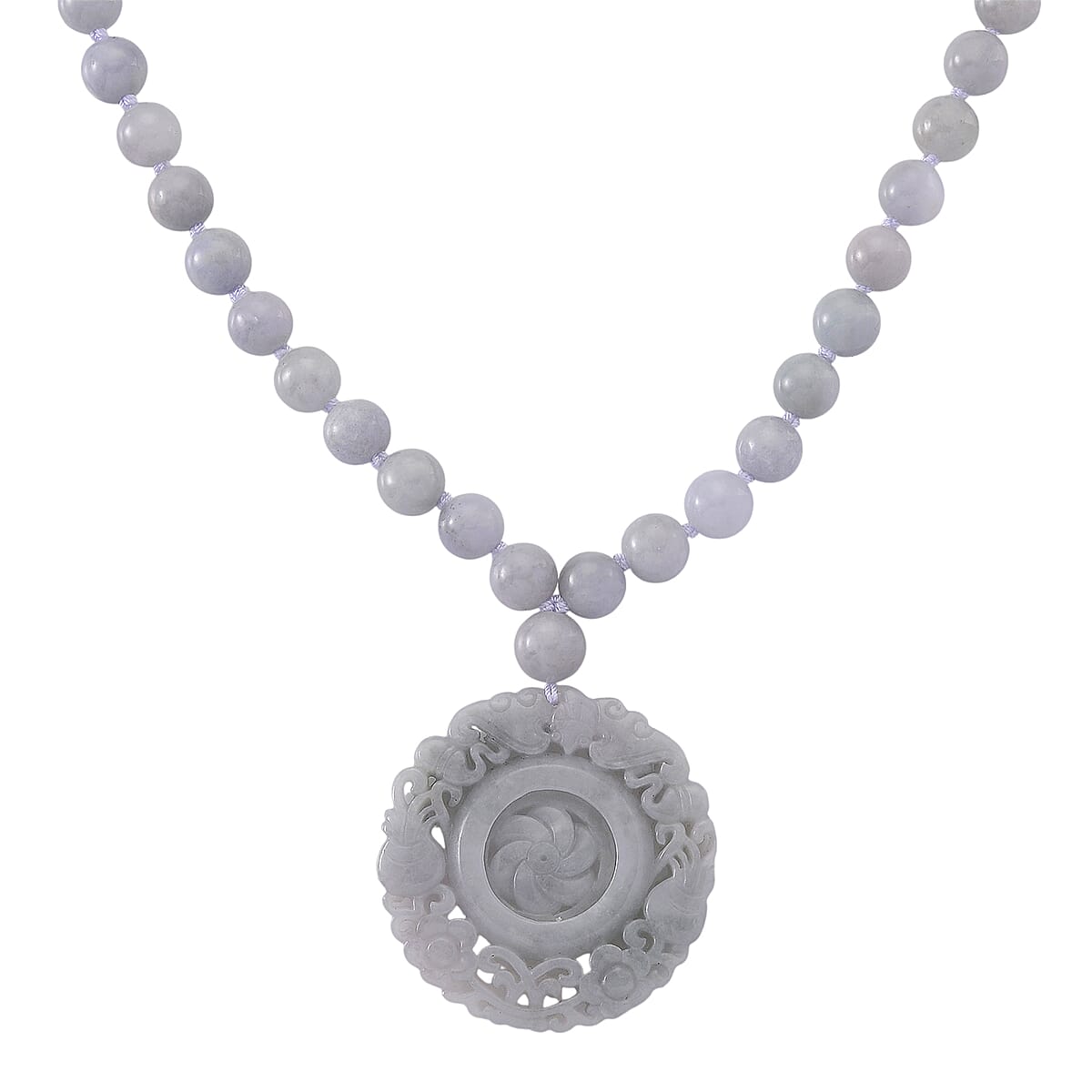 D'Joy Natural Jade 520.00 ctw Carved Flower Pendant with Beaded Necklace in Rhodium Over Sterling Silver (20 Inches)